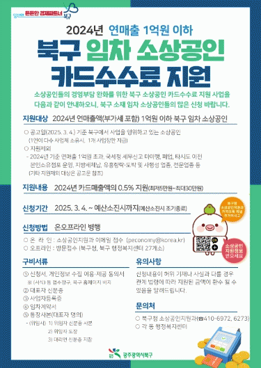한편 북구는 2022년 지원 사업을 처음 시행한 이후 작년 말까지 영세 임차 소상공인 7,000여 명에게 11억 8천여만 원의 카드수수료를 지원한 바 있다.