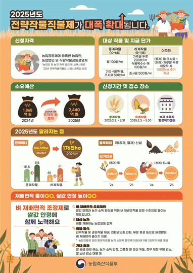 신청 및 자세한 사항은 농지 소재지 읍면동 사무소에서 확인할 수 있으며, 신청기간은 동계작물의 경우 2025년 2월 1일부터 3월 31일까지, 하계작물의 경우 2025년 2월 1일부터 5월 31일까지다.