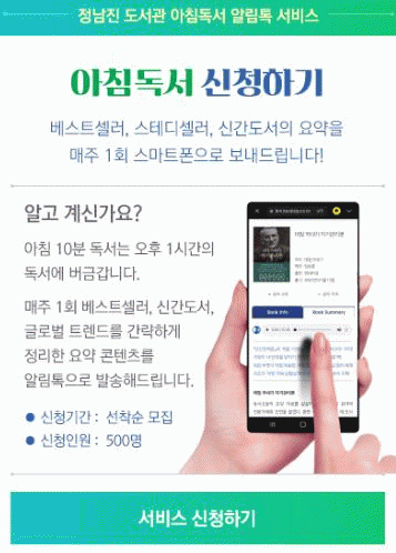 아침독서 알림톡 서비스는 군민 500명을 대상으로 매주 1회, 신간·우수도서 6권과 글로벌트렌드 1권에 대해 책의 내용을 요약해 알림톡으로 발송하는 서비스이다.