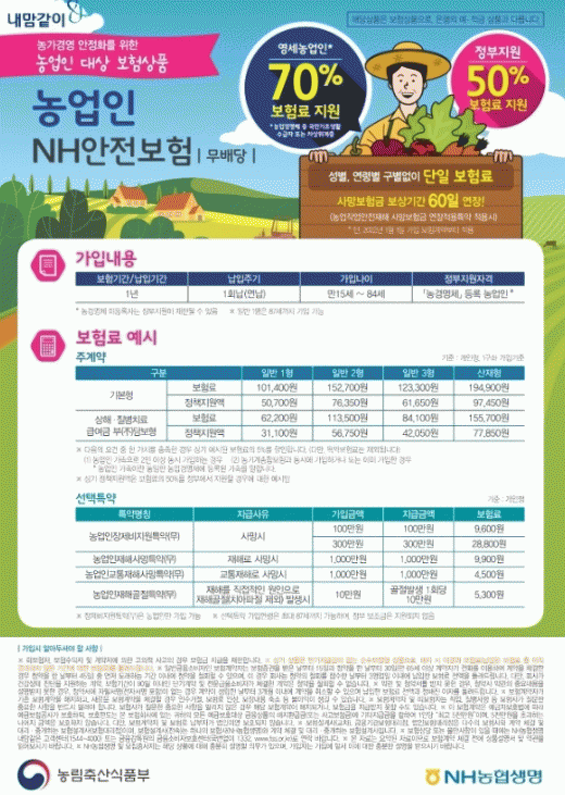 특히 농업경영체에 등록된 가족과 동시 가입하거나, 농작업 재해예방 교육 등을 수료하면 주계약 보험료의 5%를 추가로 할인받을 수 있다.