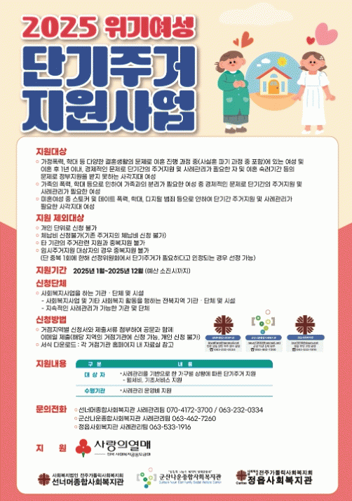 위기 여성 단기주거지원사업은 가정폭력, 학대, 이혼 등의 문제로 단기간의 주거 지원이 필요한 여성들을 대상으로 사례관리를 기반으로 한 맞춤형 주거 지원을 제공하는 사업이다.