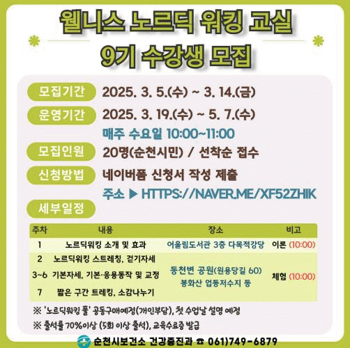 노르딕 워킹·맨발걷기 교실은 순천 시민 누구나 참여할 수 있으며 수강생 40명을 선착순으로 모집한다.