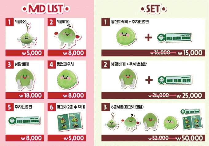 굿즈 가격은 마그넷 5천 원, 동전 파우치와 주차번호판은 각각 8천 원, 키링은 규격에 따라 5천원, 8천원, 낮잠 베개 1만 8천 원 등이다.