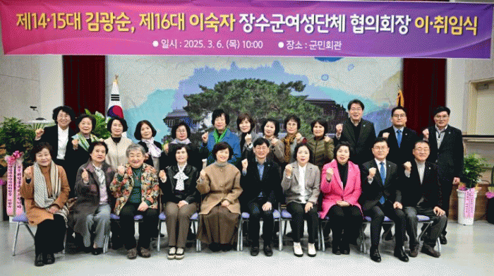 최훈식 군수는 “김광순 회장님의 헌신과 노고에 깊이 감사드리며 이숙자 신임 회장님의 취임을 축하드린다”며 “장수군도 양성이 평등하게 참여할 수 있는 지역 환경 조성을 위해 적극적으로 지원하겠다”고 전했다.