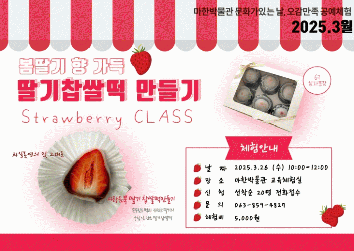 마한박물관 관계자는 "딸기를 활용한 찹쌀떡 만들기를 통해 오감이 만족하는 특별한 시간을 선사하고자 한다"며 "앞으로도 박물관이 친근하고 즐거운 문화 공간으로 자리 잡을 수 있도록 다양한 체험을 운영하겠다"고 말했다.