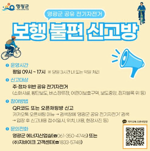 국민신문고나 콜센터를 통해 처리되던 민원 절차를 간소화하고, 군민 불편을 신속하게 해결하기 위해 ‘영광군 공유 전기자전거 보행 불편 신고방’을 개설했다.