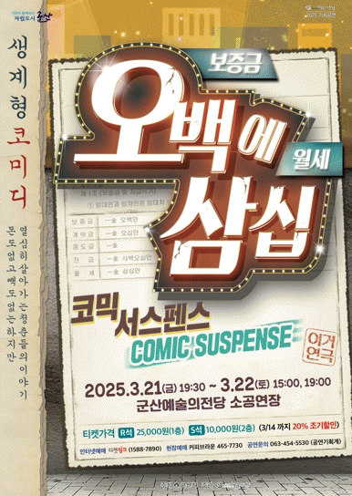 코믹 연극 '오백에 삼십'은 티켓링크에서 R석 25,000원 S석 10,000원에 구입 가능하며 3월 14일까지는 조기 할인 20%가 진행된다. 기타 자세한 사항은 군산예술의전당 누리집을 통해 확인할 수 있다.