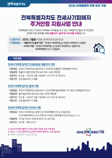 김형우 전북자치도 건설교통국장은 “전세사기 피해로 인해 주거 불안과 경제적 어려움을 겪고 있는 피해자들에게 실질적인 도움을 제공하기 위해 이번 지원사업을 마련했다”며, “보다 많은 피해자가 혜택을 받을 수 있도록 적극적인 홍보와 신속한 지원 절차 운영을 통해 안정적인 주거 환경을 조성해 나가겠다”고 밝혔다.