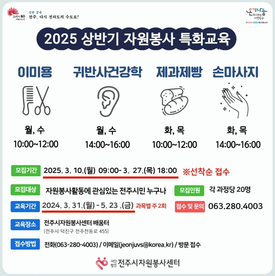교육은 전주시민이면 누구나 신청할 수 있으며, 신청서 및 자세한 사항은 전주시자원봉사센터 누리집에서 내려받은 신청서를 작성해 신청하면 된다.
