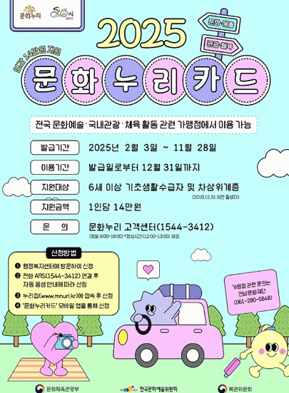 카드 발급은 오는 11월 28일까지 가능하며, 신청은 가까운 행정복지센터를 방문하거나 문화누리카드 누리집 및 모바일 앱 ‘문화누리카드’를 통해 온라인으로 할 수 있다.