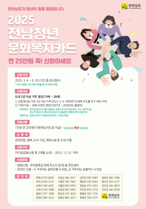 지원 대상은 2023년 3월 4일 이전부터 전라남도에 주소를 두고 계속 거주하고 있는 19세 이상 28세 이하(1997 부터 2006년 출생) 청년이며 1인당 연 25만원의 문화복지비를 지원한다.
