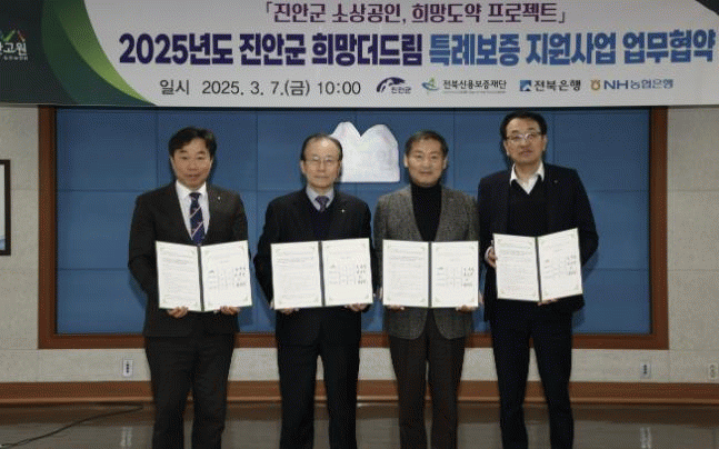 이날 협약식에는 전춘성 진안군수, 전북신용보증재단 한종관 이사장과 NH농협은행 변성섭 진안군지부장, 전북은행 전상익 부행장이 참석했다.