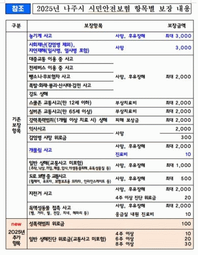 나주시는 지난해 시민안전보험 32개 보장 항목 중 4개 항목 보장금액을 확대하고 올해 2개 항목을 신설했다고 10일 밝혔다.