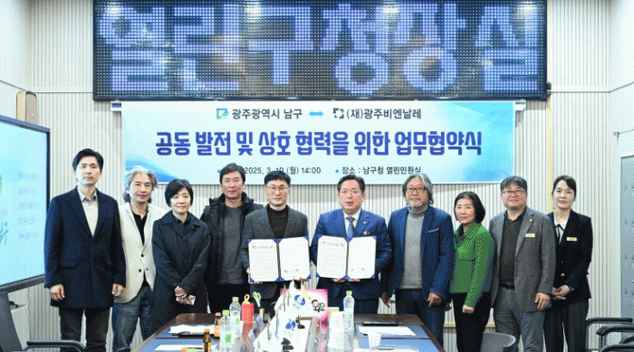 10일 남구에 따르면 김병내 구청장과 김요성 광주비엔날레 사무처장 등 양 기관 관계자들은 이날 오후 2시 구청 열린민원실에서 업무 협약을 맺었다.