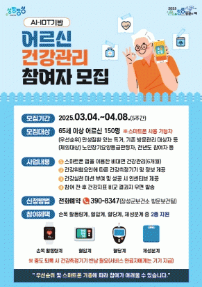 만성질환이 있는 홀몸 어르신과 기존 방문건강관리 대상주민 등을 우선 선발할 예정이다. 노인장기요양등급 판정자, 모바일헬스케어 대상자, 지난해 참여자 등은 신청할 수 없다.