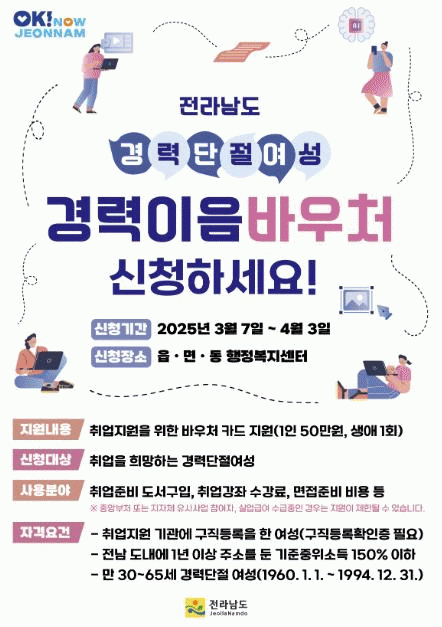 지원 대상은 신청일 기준 전라남도에 1년 이상 거주하며, 여성새로일하기센터, 고용복지플러스센터 등 취업 지원 기관에 구직 등록을 완료한 30세에서 65세 이하의 경력 단절 여성이다.