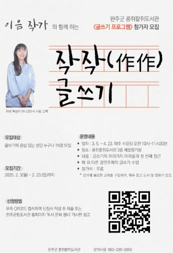 김은희 도서관사업소장은 “이번 글쓰기 프로그램이 참여자들에게 자신만의 이야기를 표현하는 소중한 시간이 되길 바란다”며 “앞으로도 다양한 문화 프로그램을 통해 군민들의 창작 활동을 적극 지원하겠다”고 밝혔다.