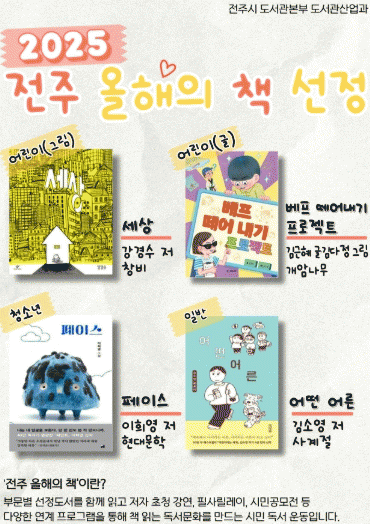 선정된 ‘2025 전주 올해의 책’은 올해 △필사릴레이 △시민공모전 △저자 초청 강연△가족 독서 골든벨 등 ‘제8회 전주독서대전’과 연계한 다양한 프로그램 진행 시 주제 도서 등으로 활용될 예정이다.