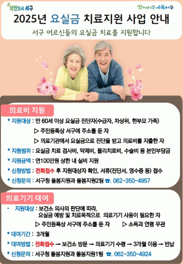 서구는 먼저 서구에 주민등록을 둔 60세 이상 요실금 진단자 중 기초생활수급자, 차상위계층 및 한부모 가족에 대해 요실금 치료를 위한 검사비, 약제비, 물리치료비, 수술비 등 의료비 본인부담금을 연 100만원 한도 내에서 실비로 지원한다.