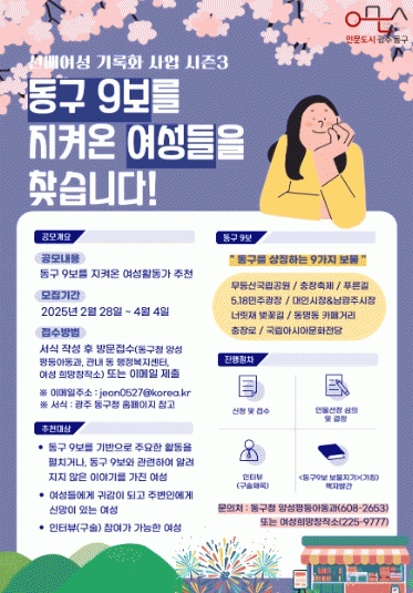 모집 대상은 동구 9보와 관련해 중요한 활동을 펼쳤거나 동구 9보에 대해 알려지지 않은 이야기를 간직한 여성들이다. 여성의 일과 삶에 대한 자긍심을 높이고, 성평등 공동체 비전을 실현하고자 하는 동구 여성이라면 누구나 참여할 수 있다. 참여를 원하는 여성은 4월 4일까지 거주지 관할 동 행정복지센터에 접수하면 되며, 동구 9보를 지켜온 여성을 추천하는 것도 가능하다.
