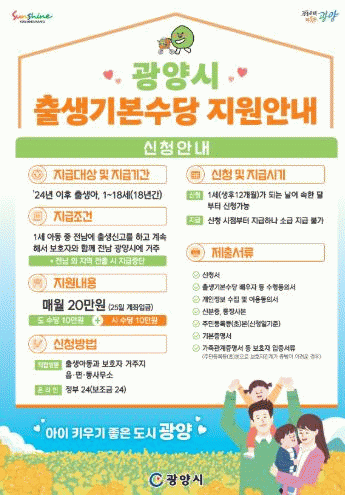 광양시 출생기본수당은 출생률 반등과 양육에 대한 경제적 부담 경감을 위해 추진하는 사업으로, 1~18세까지 18년간 예산의 범위 내에서 지원할 계획이다.