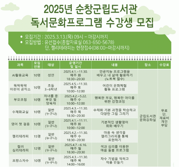보다 자세한 사항은 순창군립도서관 누리집에서 확인하거나, 전화(650-5678)로 문의하면 된다.