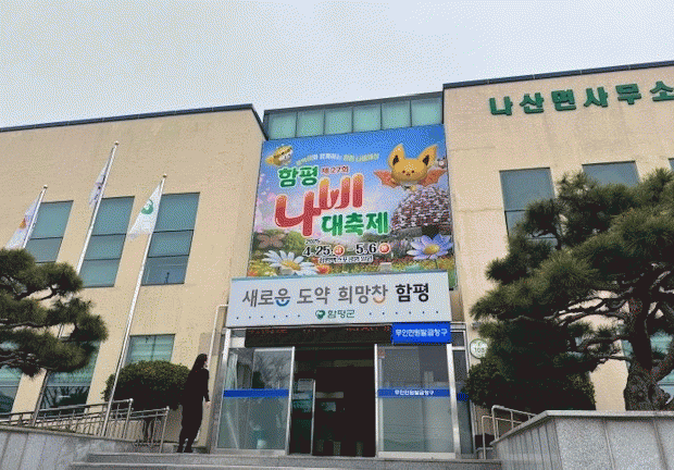 함평군은 11일 “나산면사무소가 지난 10일 청사에 대형현수막을 설치해 지역 주민과 방문객들에게 제27회 함평나비대축제를 알리며 관심과 참여를 장려하고 있다”고 밝혔다.