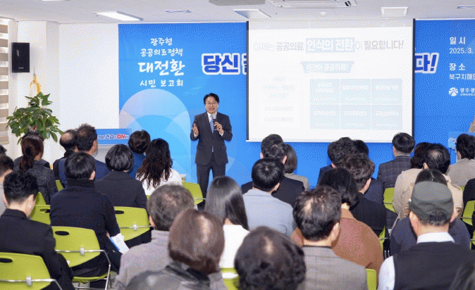 이날 보고회는 강기정 시장의 ‘광주형 공공의료 대전환 추진 방안’ 발표를 시작으로, 김혜란 동구보건소 건강정책과장, 임형석 우리동네의원 원장, 조용수 광주응급의료지원단장 등 공공보건의료 수행기관별 추진 사업과 역할 등에 대한 발표 순으로 진행됐다.