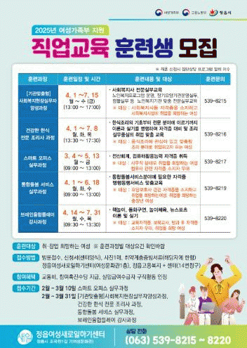 이번 직업교육훈련은 여성가족부가 주최하는 공모사업에 선정돼 진행되는 것으로, 정읍새일센터는 매년 지역 여건과 기업체 수요를 반영해 다양한 국비지원 직업교육훈련을 운영하고 있다.