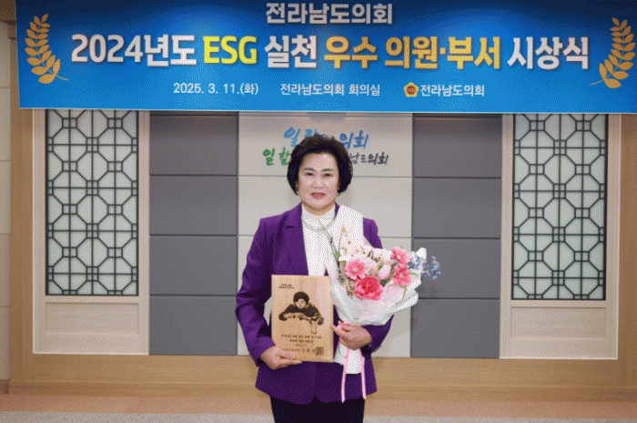 ‘ESG 추진 우수 의원’은 전라남도의회가 ESG(환경·사회·지배구조) 실천 및 인식 확산에 앞장선 우수 의원을 선정해 수여하는 상으로, 도의회 차원의 ESG 시스템 구축과 지속 가능한 의정활동을 장려하기 위해 마련됐다.