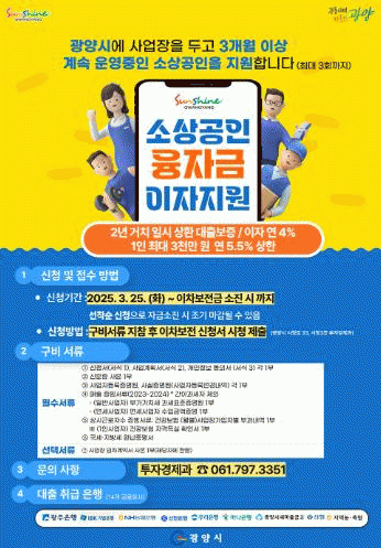 정해종 광양시 투자경제과장은 "이번 소상공인 융자금 이차보전 지원사업이 소상공인의 경영 안정과 지역 경제 활성화에 기여할 것으로 기대한다"며 "앞으로도 소상공인을 위한 실질적인 지원책을 지속적으로 마련하겠다"고 밝혔다.