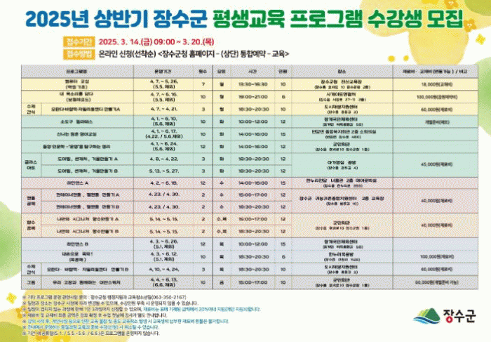 각 과정 당 인원은 6~15명 내외이며 군민회관, 장수군귀농귀촌종합지원센터, 장계국민체육센터, 번암면 종합복지회관 등 10개소에서 진행된다.