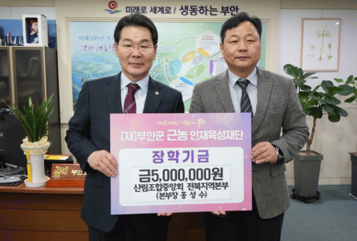 홍성수 본부장은 “학비 부담 등 어려움을 겪고 있는 지역 청년들에게 힘이 됐으면 좋겠다”며 “산림조합중앙회 전북지역본부가 앞으로도 부안군 청년들을 응원하겠다”라고 기부 취지를 밝혔다.