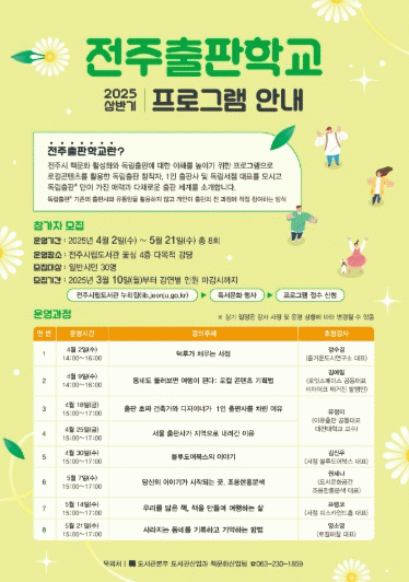 시는 ‘2025 전주출판학교’ 상반기 독립출판 특강 참가 신청을 전주시립도서관 누리집(lib.jeonju.go.kr)을 통해 접수한다고 12일 밝혔다.