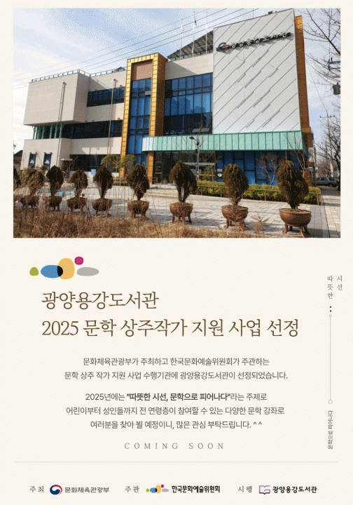이번 용강도서관의 수행 기관 선정은 2019년, 2020년, 2021년, 2023년에 이은 다섯 번째로, 향후 상주작가 채용을 거쳐 작가가 용강도서관에 상주하여 직접 문학 프로그램을 운영하여 광양 시민들을 만날 예정이다.