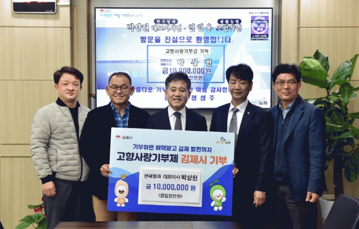 정성주 김제시장은 “김제시 고향사랑기부제에 동참해주신 박상헌 대표이사에 진심으로 감사드린다.”며 “보내주신 관심과 따뜻한 마음에 보답할 수 있도록 주민 복리증진을 위한 사업 추진에 최선을 다하겠다.”고 말했다.