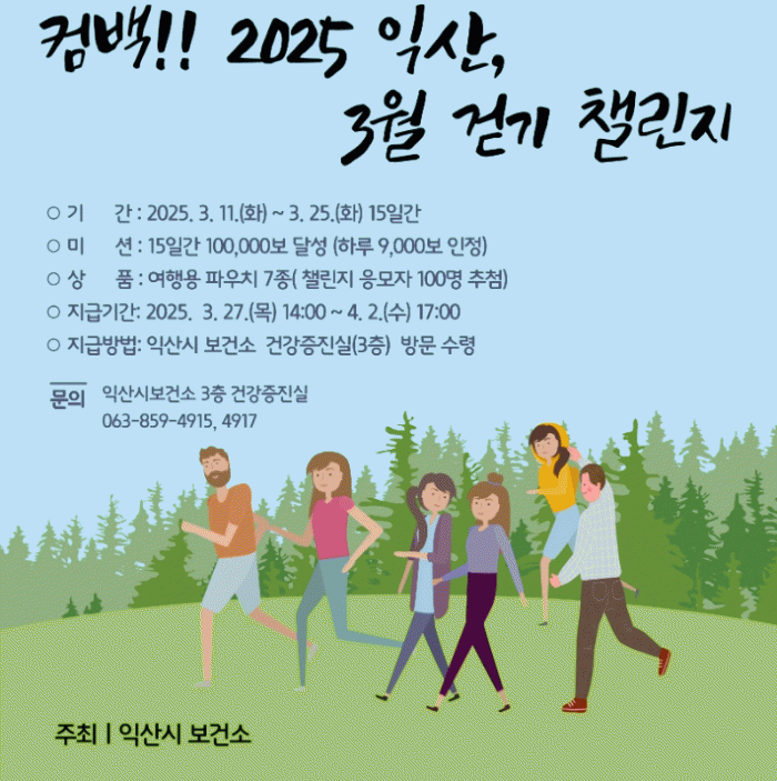 익산시 보건소는 이달부터 11월까지 매월 1회 모바일 걷기 앱 '워크온'을 통해 걷기 챌린지를 운영한다고 13일 밝혔다.