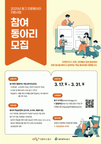 신청 기간은 이달 17일부터 31일까지이며 동구 누리집에서 신청서 등 필요 서류를 내려받아 이메일로 접수하거나 인문도시정책과로 직접 방문하면 된다.