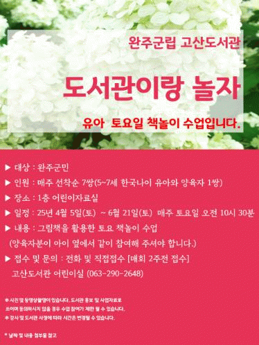 4월 5일부터 6월 21일까지 매주 토요일 오전 10시 30분에 진행되고 총 12회차를 진행하며, 자세한 일정과 내용은 완주군도서관 홈페이지 독서문화 행사안내를 참고하면 된다.