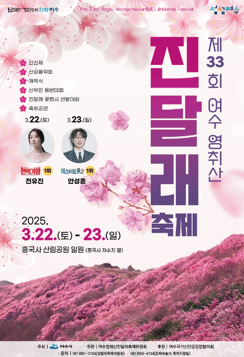 13일 여수시에 따르면 이번 축제는 국가와 지역민의 안녕을 기원하는 산신제를 시작으로 산상음악회, 새집달기, 진달래 화전 부치기 등 상춘객을 맞이하는 다채로운 행사로 진행된다.