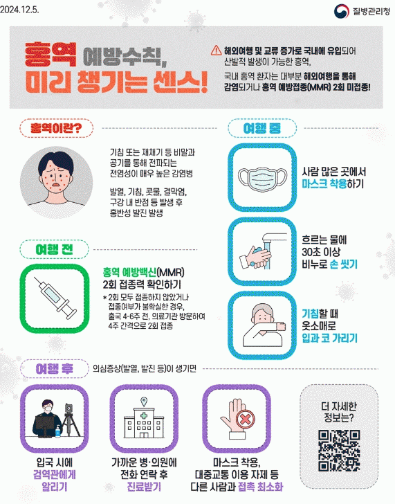 보건소 관계자는 “2회 모두 접종하지 않았거나 접종 여부가 불확실한 경우에도 4주 간격으로 접종받아야 한다”며 “출국 전 홍역 예방접종을 미리 챙기고 손 씻기, 기침 예절, 마스크 착용 등 개인위생 수칙을 철저히 해주시길 바란다”고 말했다.