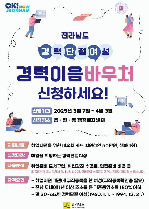 지원 대상은 취업지원기관(여성새로일하기센터, 고용복지플러스센터 등)에 구직을 등록한 30~65세(1960년 1월 1일~1994년 12월 31일 출생자) 여성으로, 신청일 기준 전라남도에 1년 이상 주소를 두고, 전월 건강보험료가 기준 중위소득 150% 이하여야 한다.