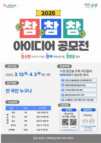 공모주제는 총 5개로 ▲광양수산물유통센터 운영 활성화 방안 ▲광양항 해양공원 이용 활성화 방안 ▲지역 상권 활력 강화 대책 ▲중장년층 대상의 복지 시책 ▲AI 활용 등 스마트 행정서비스 제공 방안이 있으며, 지역 상관없이 누구나 응모할 수 있다.