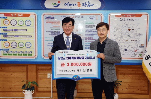 ㈜토우엔지니어링은 장흥군 지역 사회와 인재 양성에 대한 꾸준한 관심을 보이며 지난 2023년부터 현재까지 총 900만원을 기탁하고 있다.