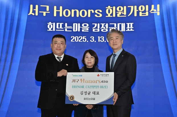 서구는 13일 금호동 ‘회뜨는 마을’ 김정균 대표와 서구아너스 회원 가입식을 진행했다. 김 대표는 연간 600만원씩 5년간 3천만원 후원을 약속했다.