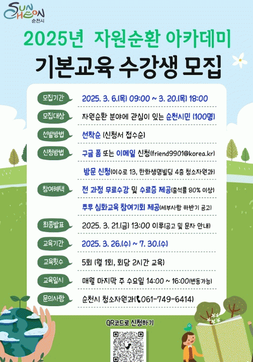 이번 교육은 자원순환 분야에 관심이 있는 순천시민 100명을 대상으로 실시하며, 3월부터 7월까지 월 1회 교육을 실시한다.