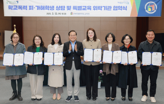 전북교육청은 13일 2층 강당에서 학교폭력 피‧가해학생 전문상담기관 및 특별교육 위탁기관 42곳과 협약을 체결했다.
