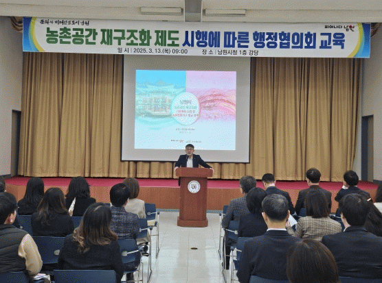 또한, 농촌공간 재구조화 제도에 대한 이해도를 높이고 정책 실현 가능성을 확보하기 위해 행정협의회 운영 전 관계자 교육을 실시했다. 교육은 3월 13일 오전 9시부터 11시까지 남원시청 1층 강당에서 진행됐으며, 남원시 부시장을 비롯해 실국소장, 담당관 및 과장, 각 부서 담당자, 읍면 산업팀장 등 120여 명이 참석한 가운데 진행됐다.