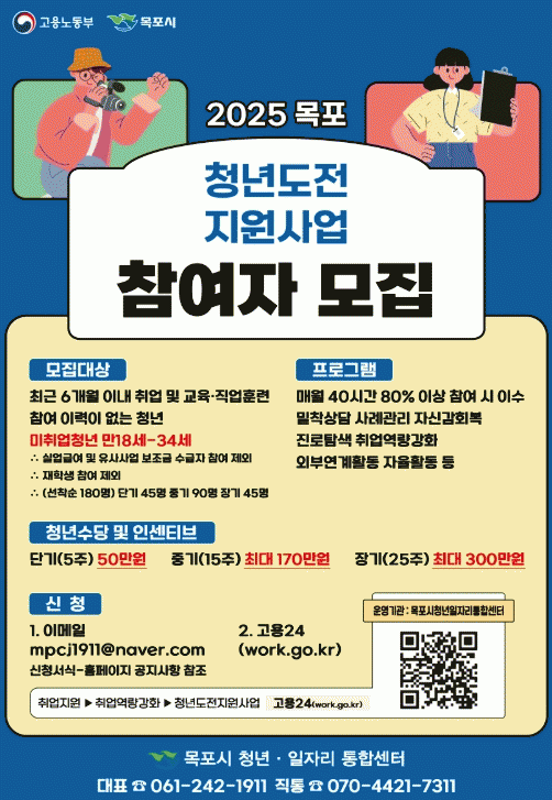 자세한 사항은 목포시 청년·일자리통합센터로 문의하면 된다.