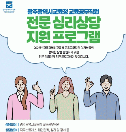 개인문제, 업무, 직장 내 대인관계 등에서 발생하는 직무 스트레스 상담을 받고 싶은 교육공무직은 대면, 전화, 이메일 등으로 신청하면 된다. 상담은 월~토요일 상담사와 협의해 장소, 방법을 정해 총 4회 회당 50분 이내 받을 수 있다.